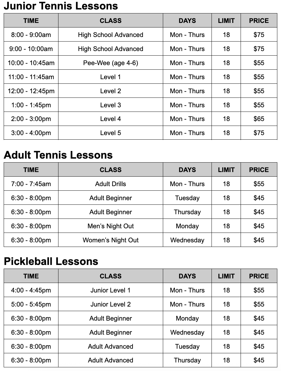 Tennis & Pickleball Lesson Schedule: